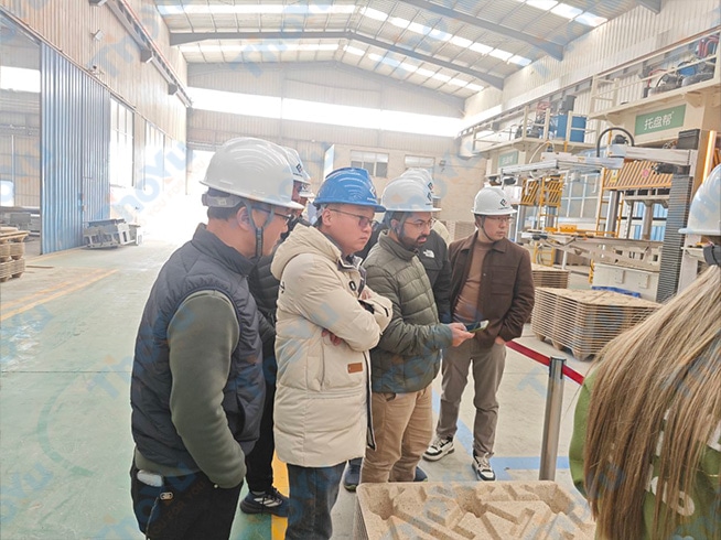 Afterwards, all the staff visited the workshop after wearing safety helmets and accepting the explanation of safety precautions. At the site, our technicians carefully explained the compressed pallet production equipment, process and sample characteristics of molded pallets, focusing on the analysis of the equipment in the tropical climate adaptability, compatibility of multiple raw materials and other special technologies, won the customer’s high recognition.