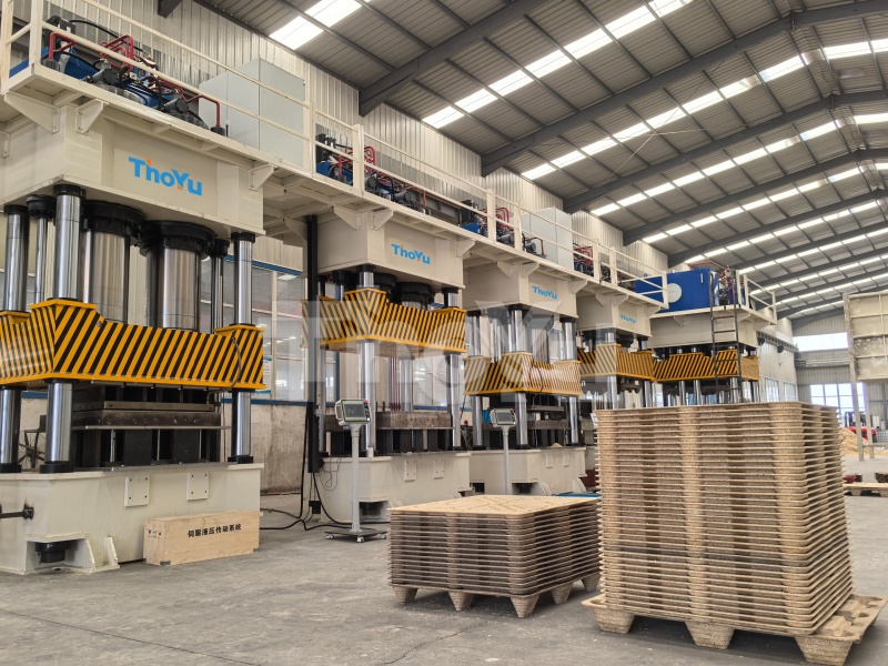 ThoYu Compress Pallet Machine utilizes vertical four-column hydraulic molding machines, with a three-beam four-column frame ensuring high strength, high rigidity, and long-term operational accuracy. The equipment integrates mechanical, pneumatic, and electrical systems, centrally controlled by a PLC with intuitive touchscreen operation.