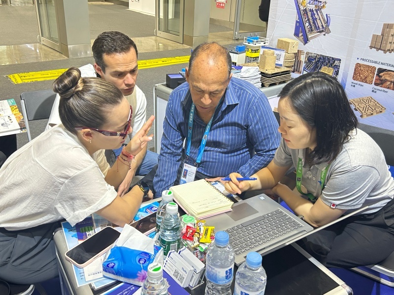 ThoYu’s booth at the Canton Fair attracted both new and returning customers from around the world, including attendees from Ethiopia, Saudi Arabia, Argentina, India, Brazil, Turkey, and more. The team, having set up early, engaged visitors with live demonstrations and comprehensive product introductions, showcasing their commitment to sustainability and efficiency in pallet manufacturing.
